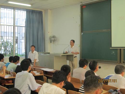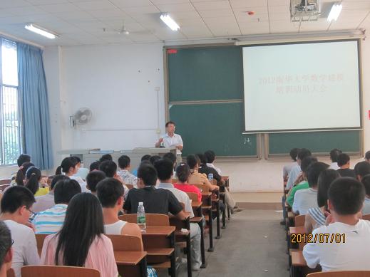 2012年7月1日上午,公司2012年全国老员工数学建模竞赛暑假培训动员会在1教114教室隆重举行。为期34天的培训工作就此拉开了序幕。球盟会经理欧阳自根教授、公司党委书记彭建军教授、副经理胡和平副教授,教务处副处长廖基定教授、数学教研室主任廖新元教授和教师代表以及去年参赛和今年校选拔赛获奖的同学(40个队)参加了此次动员会。