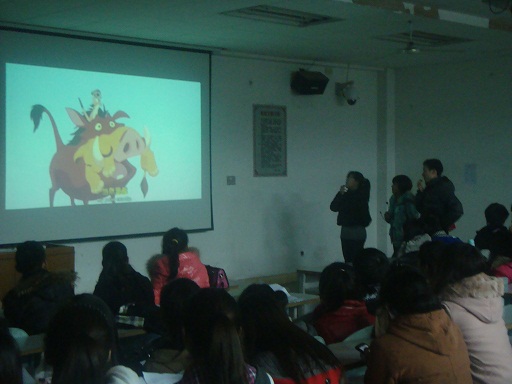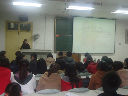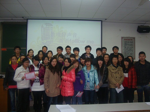 2012年12月1日晚7:30,球盟会在第九教学楼401举办“数理好声音,英语follow me”英语配音电影比赛。出席的评委嘉宾有瞿亚妮老师、袁艳玲老师、员工会主席孙勇、学习部部长李宏波。球盟会全体同学参加了本次活动,主持人由陈盈盈、付云涛两位同学担任。
