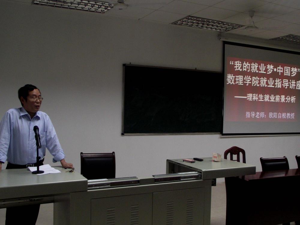 2013年5月21日晚8:00,球盟会在9教309室举办了“我的就业梦·中国梦”——理科生就业前景分析的主题讲座。讲座特邀球盟会经理欧阳自根教授主讲,参加者为2013届毕业生。