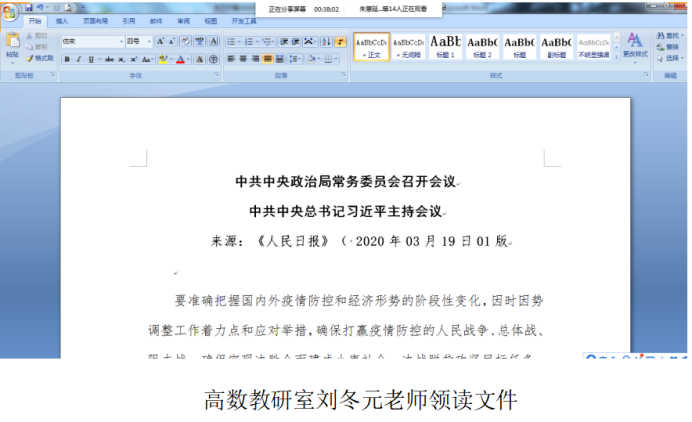 高等数学教研室党支部:首先,支部书记刘冬元带领老师们学习公司通知;然后刘冬元、高有两位老师带领老师们学习《3月18日中共中央政治局常务委员会会议精神》、《习近平:毫不放松抓紧抓实抓细各项防控工作坚决打赢湖北保卫战武汉保卫战》等文件。接着,老师们结合近期工作实际进行了研讨,主题为“结合工作实际,落实精准施策联防联控,坚决打赢疫情防控阻击战”。教研室主任黄宠辉、王红勇对线上教学,成绩的评定给出了一些建议,布置了近期老师们应该完成的工作。为了加强过程考核,王会兰老师、刘冬元老师演示了学习通上怎么布置作业、考试任务。经过这次学习,老师们纷纷表示:非常赞同中央、省委、公司党委有关部署,今后在教学科研中进一步强化责任担当,搞好网络教学工作,做到停课不停学,在疫情防控工作中尽到自己的一份力量。