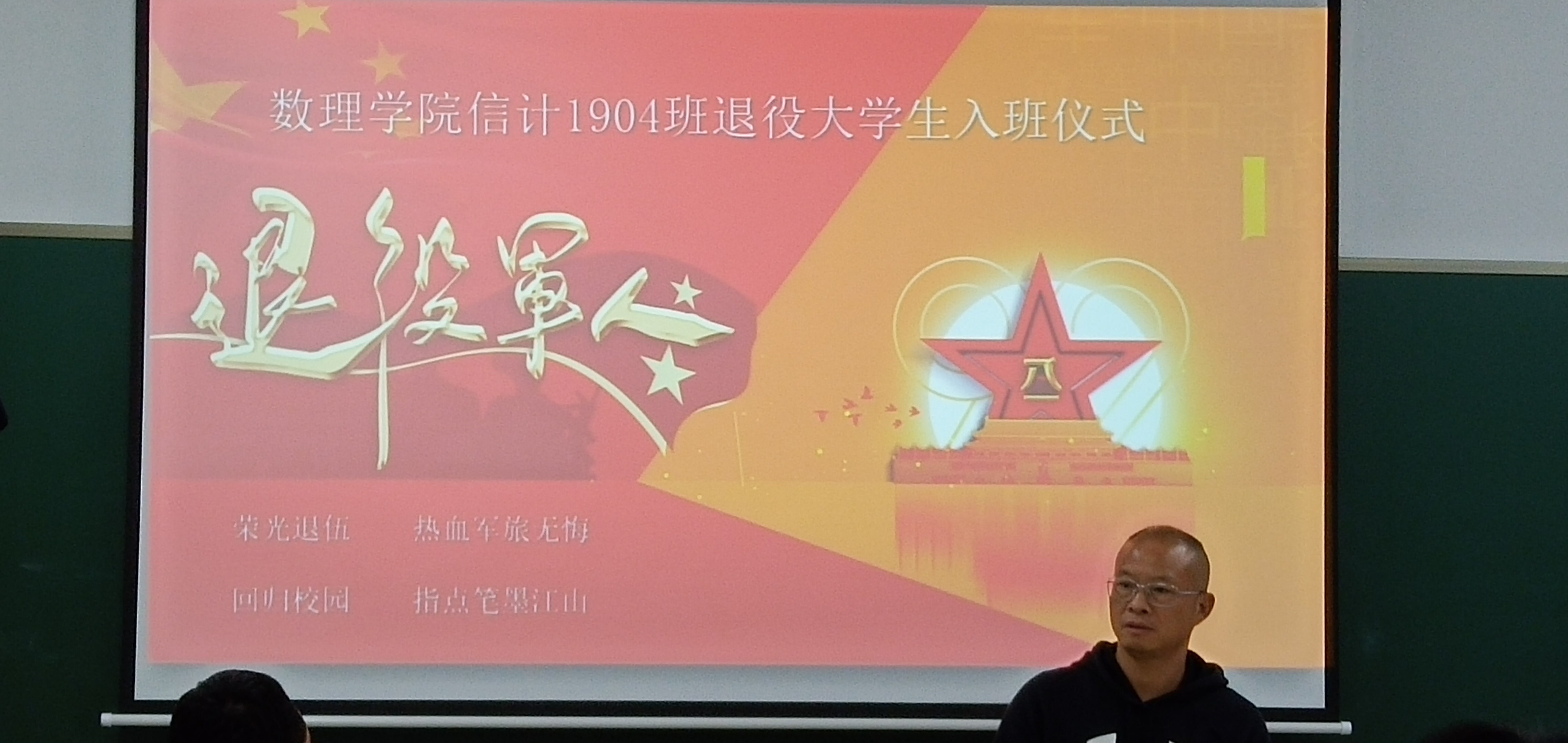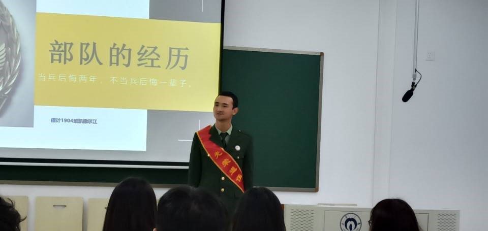 接着,凯撒尔同学分享了二年的军旅生涯经历。他挺拔的身姿感染着我们,他的精彩分享也令我们向往军队的生活。部队教会了他自律,部队教会他坚持,部队带给他作为一名军人的无比自豪感。给大家留下深刻印象且很有意义的一句话是他的班长教育他的“要么不做,要么做好”!这样的觉悟,这样的榜样,值得我们信计1904班全体同学学习,也希望我们班有了这样的新鲜血液,新的活力,能够百尺竿头更进一步,听党话跟党走,也希望凯撒尔江同学能够早日融入新集体。